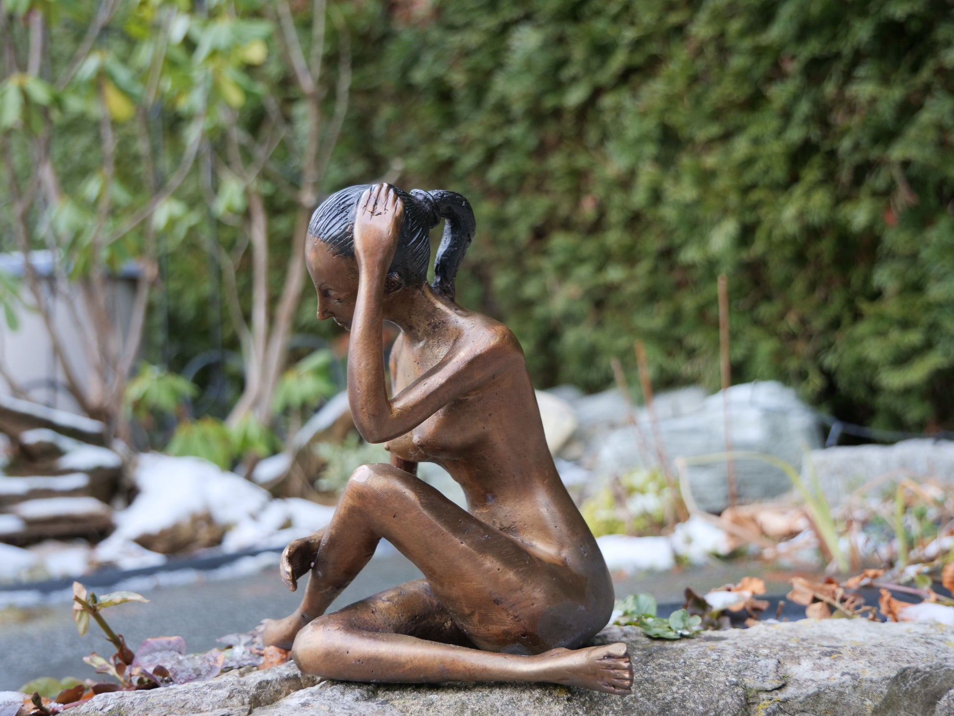 Die edle Patina unterstreicht den antiken Charakter der Figur und macht sie zu einem besonderen Blickfang. Dank des hochwertigen Messings ist die Skulptur sowohl für den Innen- als auch den Außenbereich geeignet. Ob auf einer Steinmauer, in einem Gartenbeet oder als dekoratives Element auf einem Beistelltisch – die Figur schafft eine harmonische Atmosphäre und lädt zum Verweilen ein.