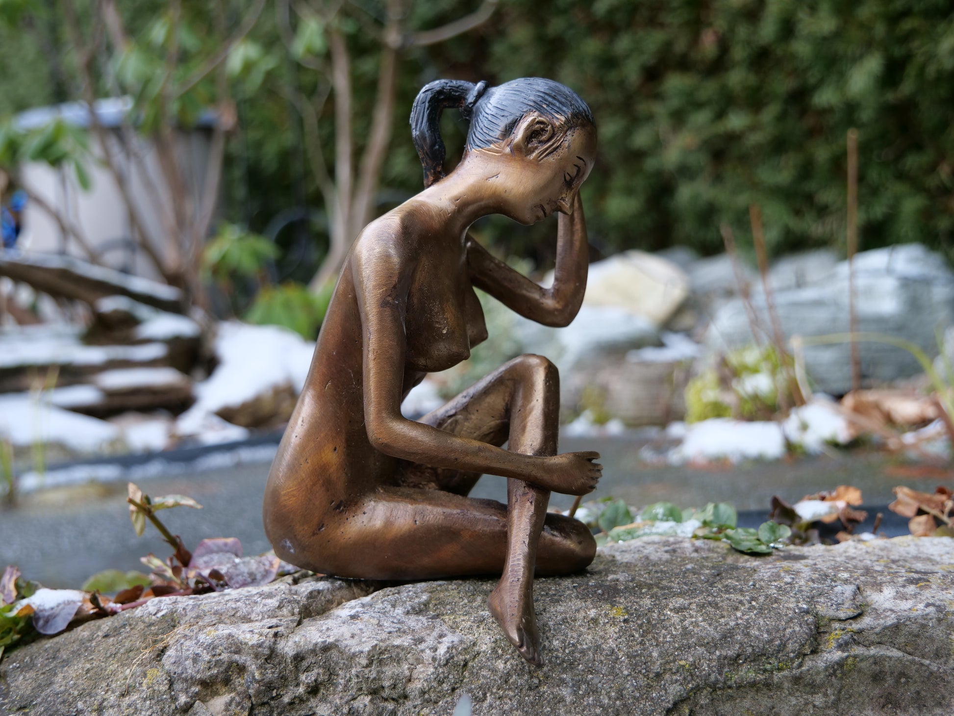 Diese wunderschöne Messingfigur stellt eine nachdenkliche Frau in entspannter Pose dar und strahlt dabei Ruhe und Gelassenheit aus. Die detailreiche Verarbeitung der Körperhaltung, Gesichtszüge und Haare verleiht ihr eine lebendige Ausdruckskraft.
